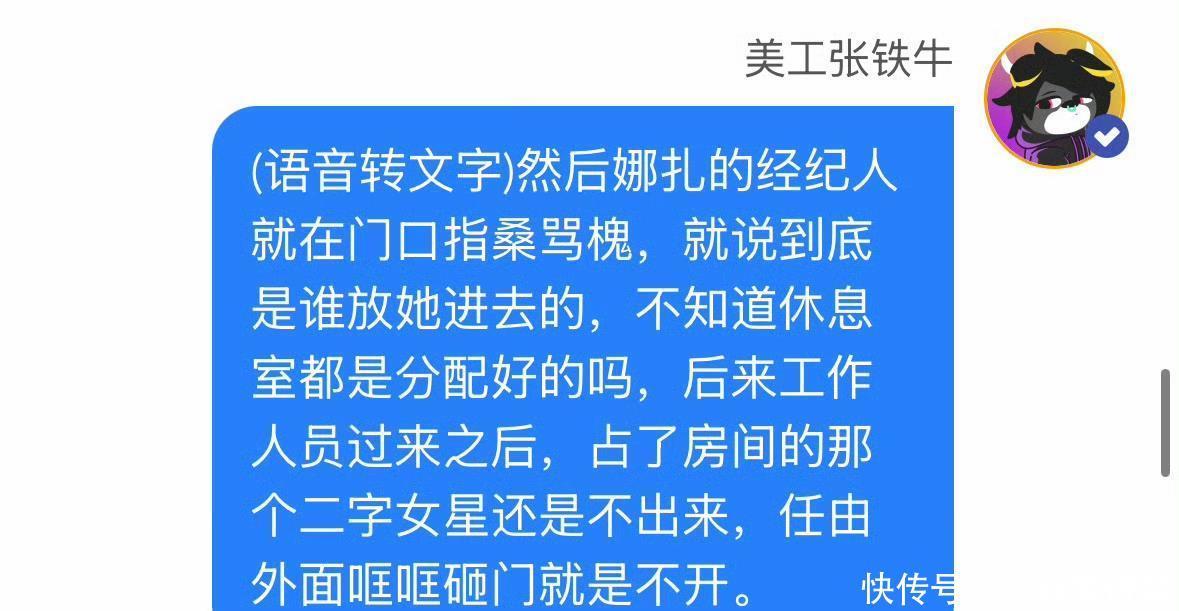 爆料的称“对方拒绝离开休息室,敲门完全不回应”,导致娜扎没办法更换衣服,最终只能去找了另一个男艺人,让他出休息室给娜扎。
